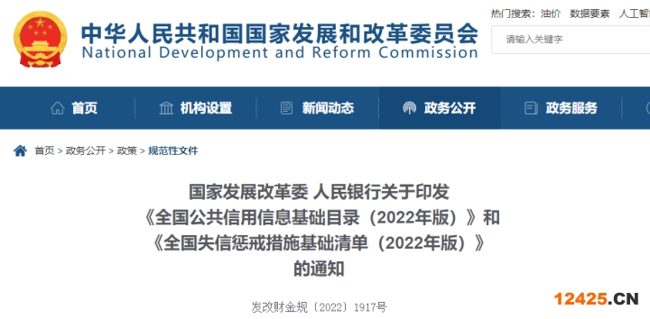 國家發(fā)展改革委 人民銀行關(guān)于印發(fā)《全國公共信用信息基礎(chǔ)目錄(2022年版)》和《全國失信懲戒措施基礎(chǔ)清單(2022年版)》的通知