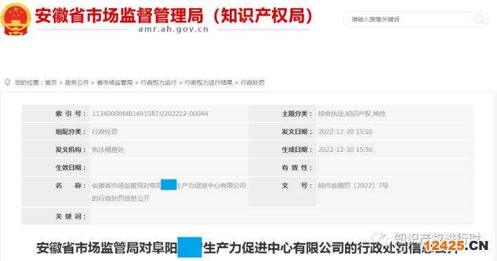 行政處罰決定書文號:皖市監(jiān)稽罰〔2022〕7號