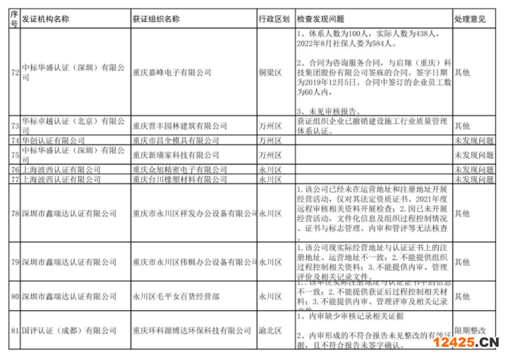 近日,重慶市市場(chǎng)監(jiān)督管理局發(fā)布關(guān)于2022年自愿性認(rèn)證從業(yè)機(jī)構(gòu) “雙隨機(jī)、一公開”監(jiān)督檢查結(jié)果的通報(bào),檢查發(fā)現(xiàn)問題149個(gè),經(jīng)濟(jì)處罰1家,限期整改25家,未發(fā)現(xiàn)問題40家,其他32家。詳情如下: