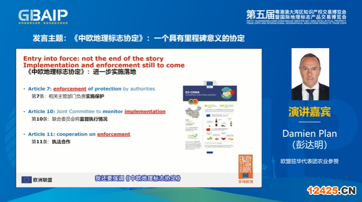 歐盟駐華代表團農業(yè)參贊Damien Plan(彭達明)以“《中歐地理標志協(xié)定》:一個具有里程碑意義的協(xié)定”為主題發(fā)表演講,重點討論了《中歐地理標志協(xié)定》對中歐雙方的互惠意義。彭達明表示,“執(zhí)行”和“促進”這兩個關鍵詞是該協(xié)定取得成功的重要保障。同時,彭達明列舉了地理標志對生產者、原產地乃至國家和地區(qū)的三大好處,包括溢價助農、保證原產地和鄉(xiāng)村振興。地理標志的高水平保護將使得雙方互認互保的產品可以得到有效保護,歐盟和中國應當共同推動提升地理標志的公眾認知,形成社會共識,保障中歐雙方利益最大化。