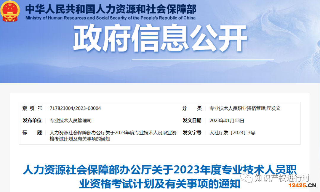 核心提示:今日,人力資源社會(huì)保障部發(fā)布《2023年度專業(yè)技術(shù)人員職業(yè)資格考試計(jì)劃》,發(fā)布了知識(shí)產(chǎn)權(quán)師、專利代理師、律師的考試時(shí)間:注意:2023年專