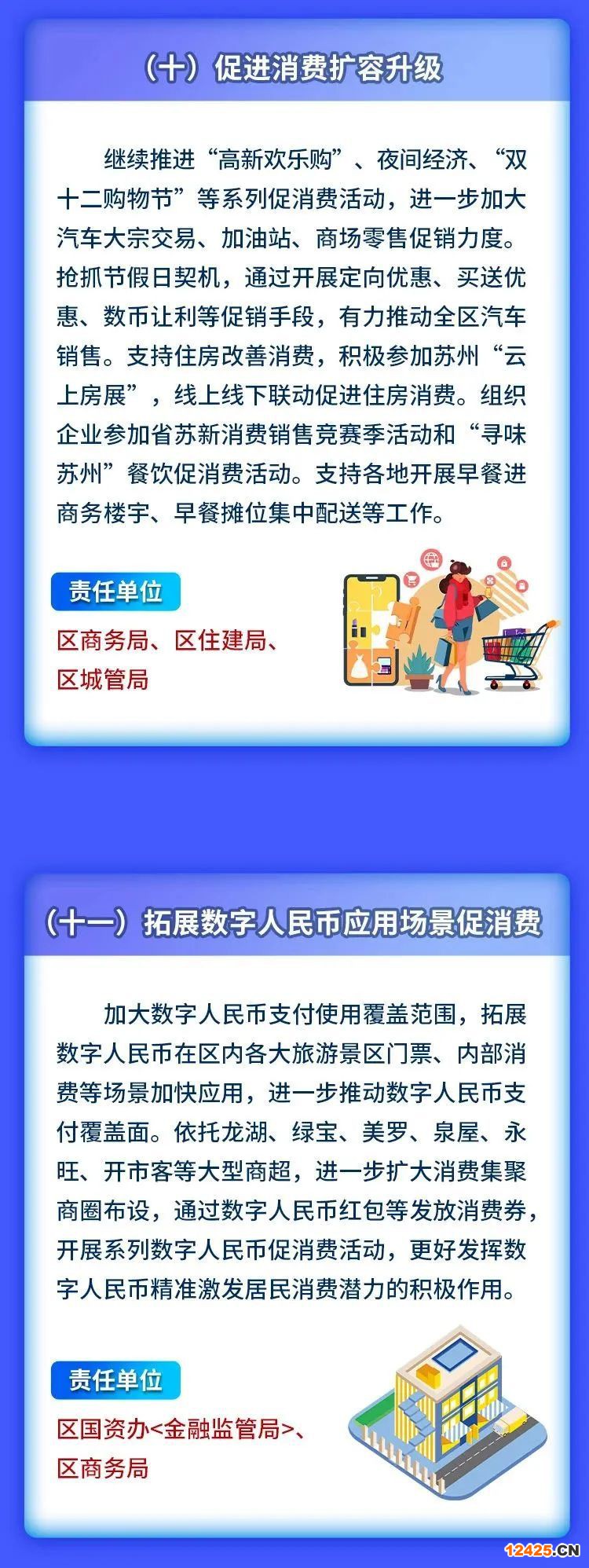 28. 支持現(xiàn)代商貿(mào)流通體系建設(shè)和促消費(fèi)工作,進(jìn)一步打響“樂(lè)購(gòu)吳江”“點(diǎn)亮蘇州灣”等消費(fèi)節(jié)慶品牌,持續(xù)辦好蘇新消費(fèi)、五五購(gòu)物節(jié)、雙12蘇州購(gòu)物節(jié)、夜經(jīng)濟(jì)等系列活動(dòng),區(qū)級(jí)財(cái)政資金給予支持。發(fā)放餐飲、零售、住宿等專項(xiàng)消費(fèi)券。鼓勵(lì)吳江本土品牌入駐商業(yè)綜合體并給予支持。大力發(fā)展首店首發(fā)經(jīng)濟(jì)、直播經(jīng)濟(jì)等。鼓勵(lì)舉辦高水平專業(yè)展會(huì),支持舉辦大型市場(chǎng)化專業(yè)會(huì)議和會(huì)展品牌推介會(huì)。支持各區(qū)鎮(zhèn)開(kāi)展早餐進(jìn)商務(wù)樓宇、早餐攤位集中配送等工作。持續(xù)推動(dòng)一刻鐘便民生活圈試點(diǎn)工作。鼓勵(lì)數(shù)字商務(wù)、繭絲綢、老字號(hào)等行業(yè)領(lǐng)域創(chuàng)新發(fā)展并給予支持。積極參與江蘇味道餐飲促消費(fèi)活動(dòng),組織企業(yè)提升限上零售額,參與全省銷(xiāo)售競(jìng)賽季活動(dòng)。組織開(kāi)展新能源汽車(chē)推廣應(yīng)用、綠色智能家電下鄉(xiāng)等促消費(fèi)活動(dòng)。延續(xù)實(shí)施新能源汽車(chē)免征車(chē)輛購(gòu)置稅政策。支持住房改善消費(fèi),線上線下聯(lián)動(dòng)促進(jìn)住房消費(fèi)。(責(zé)任單位:區(qū)商務(wù)局、區(qū)工信局、區(qū)財(cái)政局、吳江稅務(wù)局、區(qū)住建局、區(qū)城管局)
