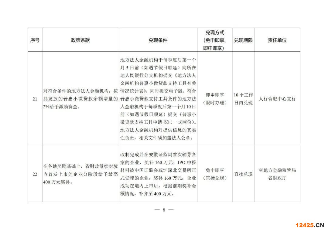 7﹒推動企業(yè)上市融資。支持實施企業(yè)上市“迎客松行動”計劃,新增上市企業(yè)30家以上。(責(zé)任單位:省地方金融監(jiān)管局、安徽證監(jiān)局)在各地獎勵基礎(chǔ)上,省財政繼續(xù)對境內(nèi)首發(fā)上市的企業(yè)分階段給予最高400萬元獎補(bǔ)。企業(yè)首次在新三板基礎(chǔ)層掛牌一次性獎補(bǔ)10萬元,在創(chuàng)新層掛牌一次性獎補(bǔ)20萬元。對在省區(qū)域性股權(quán)市場“專精特新板”掛牌企業(yè)給予20萬元獎補(bǔ),對在“科創(chuàng)專板”掛牌并股改企業(yè)給予10萬元獎補(bǔ)。(責(zé)任單位:省地方金融監(jiān)管局,配合單位:省財政廳、省經(jīng)濟(jì)和信息化廳)