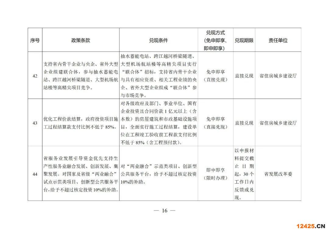 15﹒促進(jìn)建筑業(yè)發(fā)展。在水利、公路、機(jī)場、鐵路、電力、通信等專業(yè)市場領(lǐng)域開展“評定分離”試點。支持省內(nèi)骨干企業(yè)與央企、省外大型企業(yè)組建聯(lián)合體,參與抽水蓄能電站、跨江越河橋梁隧道、大型機(jī)場航站樓等高精尖項目競爭。優(yōu)化工程價款結(jié)算,政府投資項目施工過程結(jié)算款支付比例不低于85%。(責(zé)任單位:省住房城鄉(xiāng)建設(shè)廳)