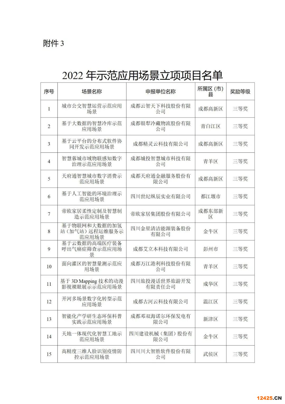 按照《成都市人民政府辦公廳關于印發(fā)供場景給機會加快新經濟發(fā)展若干政策措施的通知》(成辦發(fā)〔2020〕34號)《市新經濟委 市財政局關于印發(fā)〈2022年度新經濟發(fā)展專項資金申報指南〉和開展申報審核工作的通知》(成新經濟〔2022〕16號)等文件精神,經企業(yè)自主申報、各區(qū)(市)縣新經濟主管部門初審推薦、專家評審、市級部門查重、公示入庫等程序,最終從公示入庫儲備項目中確定14個城市未來場景實驗室、4個應用場景示范區(qū)、49個示范應用場景項目立項,現(xiàn)予以公布,請各相關單位做好以下工作。