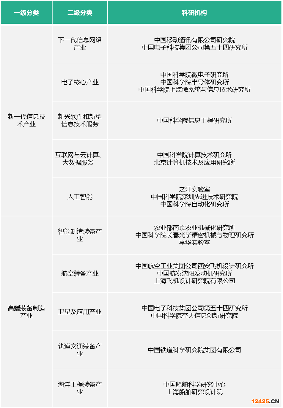 領(lǐng)域布局能在一定程度上體現(xiàn)科研機(jī)構(gòu)的研究領(lǐng)域和科研方向。根據(jù)智慧芽數(shù)據(jù)庫(kù)給出的戰(zhàn)略新興產(chǎn)業(yè)分類(lèi)字段統(tǒng)計(jì),科研機(jī)構(gòu)發(fā)明專(zhuān)利申請(qǐng)的側(cè)重點(diǎn)各有不同。本文以最熱門(mén)的兩大產(chǎn)業(yè):新一代信息技術(shù)產(chǎn)業(yè)和高端裝備制造產(chǎn)業(yè)作為科研機(jī)構(gòu)布局的領(lǐng)域進(jìn)行分析。就新一代信息技術(shù)產(chǎn)業(yè)而言,在電子核心產(chǎn)業(yè)方向上有中科院微電子所和中科院半導(dǎo)體所等大型研究所,而在人工智能方向上,之江實(shí)驗(yàn)室、中科院深圳先進(jìn)技術(shù)研究所顯得更有活力。在高端裝備制造產(chǎn)業(yè)方面,季華實(shí)驗(yàn)室在智能制造裝備產(chǎn)業(yè)方向上進(jìn)行了不少發(fā)明專(zhuān)利布局。衛(wèi)星、軌道和海洋三個(gè)領(lǐng)域因?yàn)橛衅涮厥庑?,因此科研機(jī)構(gòu)也相對(duì)集中。