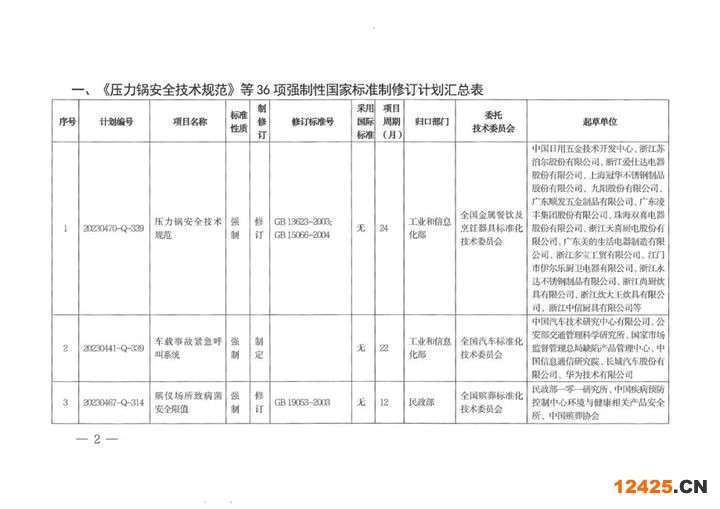 日前,《國(guó)家標(biāo)準(zhǔn)化管理委員會(huì)關(guān)于下達(dá)〈壓力鍋安全技術(shù)規(guī)范〉等36項(xiàng)強(qiáng)制性國(guó)家標(biāo)準(zhǔn)制修訂計(jì)劃及相關(guān)標(biāo)準(zhǔn)外文版計(jì)劃的通知》正式發(fā)布。具體內(nèi)容如下: