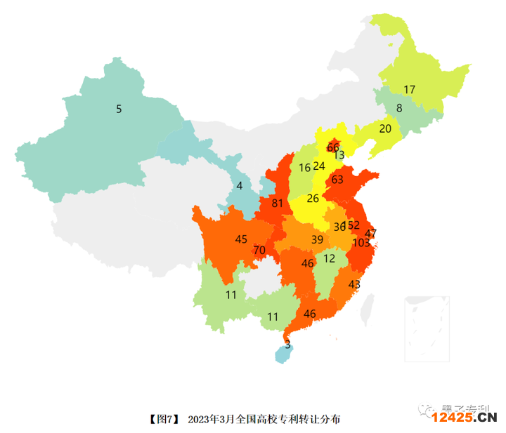 2023年3月全國(guó)高校專利轉(zhuǎn)讓分布如【圖7】,江蘇省以 152 件專利發(fā)生轉(zhuǎn)讓位居第一、浙江省 103 件、陜西省 81 件;轉(zhuǎn)讓專利TOP10的高校如【圖8】,其中江南大學(xué)轉(zhuǎn)讓 43 件專利位居第一、西北工業(yè)大學(xué)轉(zhuǎn)讓 25 件專利位居第二,其次是重慶大學(xué)轉(zhuǎn)讓 24 件專利;科研院所專利轉(zhuǎn)讓TOP10如【圖9】,其中, 中國(guó)科學(xué)院深圳先進(jìn)技術(shù)研究院29 件,排名第一。