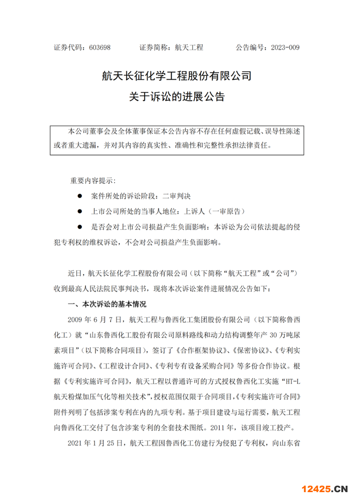 2023年5月25日,航天長征化學(xué)工程股份有限公司(下稱“航天工程”)發(fā)布了關(guān)于訴訟進(jìn)展的公告。航天工程與魯西化工集團(tuán)股份有限公司(下稱“魯西化工”)的專利訴訟二審判決結(jié)果顯示,航天工程索賠4200萬的訴訟請求被駁回。