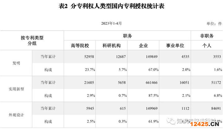 按照專利權(quán)人的類型進(jìn)行分類統(tǒng)計(jì)2023年4月國(guó)內(nèi)的專利授權(quán)量,5類專利權(quán)人的實(shí)用新型專利授權(quán)量全部下降。個(gè)人類型的實(shí)用新型授權(quán)量下降54.23%。