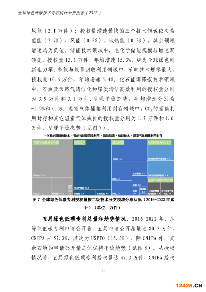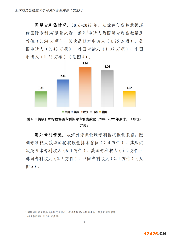 “近日,國家知識產(chǎn)權局發(fā)布了《全球綠色低碳專利統(tǒng)計分析報告》。其中提到:全球綠色低碳專利布局高度集中在中美日歐韓五局。2016- 2022 年,中美日歐韓五局綠色低碳專利申請公開量依次排名前五位, 合計占全球總量的76.7%,其中CNIPA為46萬件,占43.9%。印度局和巴西局排名第六位和第七位,亦是綠色低碳專利重要目標市場。其中,USPTO受理外國申請人提交的綠色低碳專利申請公開量居首位,為8.2萬件,CNIPA 次之,為7. 1萬件,是吸引國外綠色低碳專利申請最多的兩個國家。”