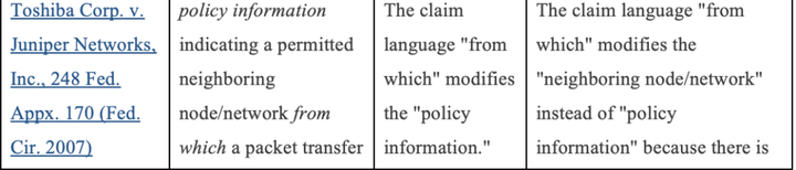 法院通常適用the last antecedent原則:除非有相反的意圖,修飾性詞語和短語只修飾最后的前導項。相反,當逗號將一系列前導項與修飾語分隔開時,修飾語適用于每個前導項。例如,在限制性權利要求中提到“the executable tamper resistant key module including the generated private key and the encrypted predetermined data”,“including”只修飾“the executable tamper resistant key”,而不是其他前導項。