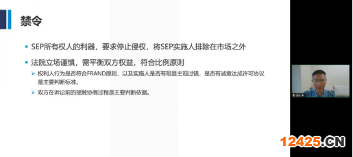 首先進行分享的是來自博睿律師事務(wù)所的潘煒律師,他延續(xù)了上一場《通信領(lǐng)域標(biāo)準(zhǔn)必要專利許可面臨的主要挑戰(zhàn)》的主題分享。這一次他主要介紹了歐洲法院、中國法院以及美國法院開具的SEP禁令的相關(guān)案件,從而深入解讀了有關(guān)SEP濫用市場支配地位的判定以及SEP搭售的相關(guān)問題,同時對高通反壟斷處罰一案進行了介紹分析。之后他又從5G物聯(lián)網(wǎng)時代新增的挑戰(zhàn)層面,介紹了Avanci這一機構(gòu)及其與德國車企的SEP許可糾紛。最后,又分別介紹了歐洲、英國、美國以及亞洲等國家或地區(qū)的SEP相關(guān)規(guī)定,并就此提出了自己的建議和想法。