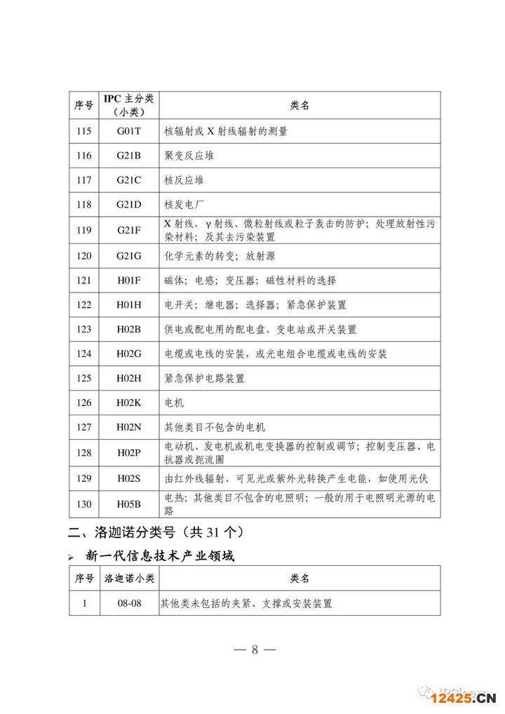 經(jīng)國家知識產(chǎn)權(quán)局核定,陜西省知識產(chǎn)權(quán)保護中心專利預審服務分類號范圍確定為:屬于新一代信息技術(shù)和新能源產(chǎn)業(yè)領(lǐng)域的130個國際專利分類(IPC)主分類小類和31個洛加諾分類號小類(詳見附件),現(xiàn)予以公布。