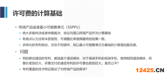 有關(guān)許可費(fèi)的計(jì)算基礎(chǔ),有個(gè)概念叫SSPPU,就是最小可銷售單元,就是計(jì)算基礎(chǔ)應(yīng)該是終端產(chǎn)品還是按照最小可銷售單元。因?yàn)榻K端產(chǎn)品的話,專利所涉及到的部件可能只是手機(jī)的一小部分,那么最終許可費(fèi)是按照這個(gè)終端產(chǎn)品價(jià)格來計(jì)算,還是應(yīng)該按照比如說通信模塊的價(jià)格來計(jì)算?這是有比較大的一個(gè)分歧,但目前來看的話,至少在手機(jī)3G 4G時(shí)代的話,絕大多數(shù)判決或者重量裁決都是以終端產(chǎn)品作為計(jì)費(fèi)基礎(chǔ)的。有觀點(diǎn)認(rèn)為沒有本質(zhì)差別,可調(diào)整比率使得最終的結(jié)果一致。