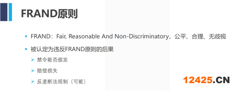 FRAND原則是貫穿整個(gè)SEP最重要的一個(gè)概念,它縮寫是Fair, Reasonable And Non-Discriminatory,公平、合理、無歧視,這個(gè)是一個(gè)大致的原則,它的后果是如果你被認(rèn)定為行為違反FRAND原則,那么可能會(huì)影響禁令能否頒發(fā),還可能會(huì)被要求賠償損失;還有可能被反壟斷法規(guī)制。