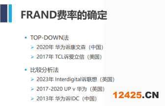 FRAND費(fèi)率確定的難度非常大,主要有兩種方法,一個(gè)是自上向下,TOP-DOWN法,還有一種方法是比較分析法。通過已經(jīng)發(fā)生的實(shí)體之間的協(xié)議,分析與本案相關(guān)的最具比較性的協(xié)議作為重要參考來確定具體費(fèi)率。