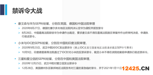 有三個(gè)比較典型的禁令案。首先是康文森跟華為糾紛案,他起訴的時(shí)間節(jié)點(diǎn)如下圖:2020年8月27日,德國(guó)杜塞爾多夫地區(qū)法院判決認(rèn)定華為侵權(quán)并頒發(fā)禁令。隔了一天也就是8月28日,中國(guó)最高法院即依華為申請(qǐng)作出裁定,要求康文森不得在最高法院就在審案件作出終審判決前,申請(qǐng)執(zhí)行前述禁令。其后是小米與IDC的SEP糾紛案,分別在中國(guó)和印度法院審理。2020年9月23日,武漢中院對(duì)IDC發(fā)出禁訴令,這個(gè)禁訴令寬泛很多,禁止IDC在其它國(guó)家地區(qū)法院請(qǐng)求裁定SEP許可費(fèi)率,在海外引起了非常大的爭(zhēng)議和反對(duì)。然后在2020年10月9日,印度德里高等法院通過了IDC針對(duì)小米的反禁訴禁令,裁定小米不得在該院結(jié)案前申請(qǐng)執(zhí)行前述禁訴令。三星和愛立信的SEP糾紛案也類似上述案件,分別在中國(guó)和美國(guó)法院審理。