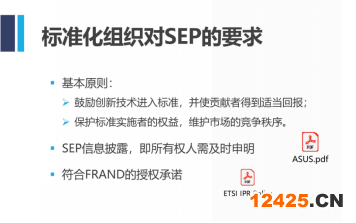 SEP,即標(biāo)準(zhǔn)必要專利,縮寫是Standard Essential Patent,根據(jù)ETSI的定義,指從技術(shù)方面來說對(duì)于實(shí)施標(biāo)準(zhǔn)必不可少的專利。比如外觀設(shè)計(jì)專利不可能是標(biāo)準(zhǔn)必要專利,實(shí)用新型或者發(fā)明專利才可能是標(biāo)準(zhǔn)必要專利。廣東高院有一個(gè)SEP的審判指引文件,把它總結(jié)為實(shí)施某一技術(shù)標(biāo)準(zhǔn)而必須使用的專利。這里可以看到前面ETSI的定義中,基于商業(yè)方面的考量,即商業(yè)利益特別大導(dǎo)致不得不用,那么這個(gè)也不能算是標(biāo)準(zhǔn)必要專利,它一定是從技術(shù)層面上來說,是不可規(guī)避的專利。