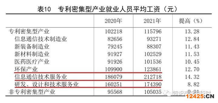2021年我國(guó)專(zhuān)利密集型產(chǎn)業(yè)就業(yè)人員數(shù)為4870.64萬(wàn)人,專(zhuān)利密集型產(chǎn)業(yè)就業(yè)人員數(shù)占全社會(huì)就業(yè)人員數(shù)的比重為6.52%;我國(guó)專(zhuān)利密集型產(chǎn)業(yè)城鎮(zhèn)非私營(yíng)單位就業(yè)人員平均工資為115796元,分產(chǎn)業(yè)看,信息通信技術(shù)服務(wù)業(yè)就業(yè)人員平均工資最高,為212718元,其次為研發(fā)、設(shè)計(jì)和技術(shù)服務(wù)業(yè),為174390元;環(huán)保產(chǎn)業(yè)排在第三,為123861元。