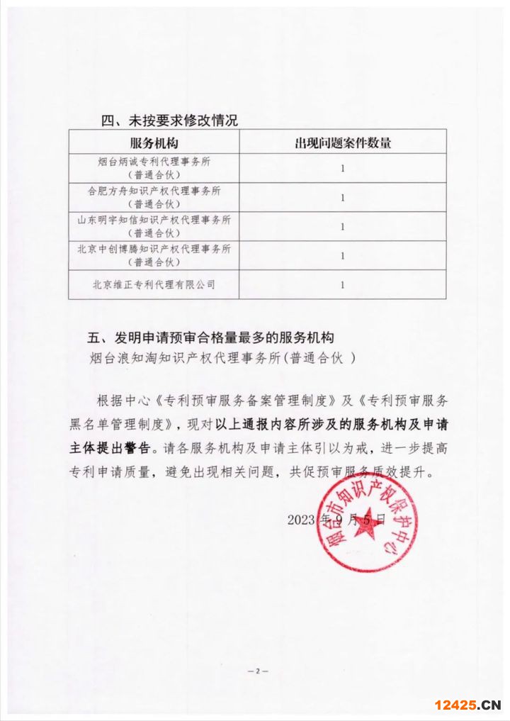 近日,煙臺(tái)市知識(shí)產(chǎn)權(quán)保護(hù)中心發(fā)布了2023年8月專(zhuān)利預(yù)審情況通報(bào)。根據(jù)通報(bào)顯示,山東兩家知識(shí)產(chǎn)權(quán)事務(wù)所因代理兩家企業(yè)非正常和低質(zhì)量被通報(bào)警告。3家代理機(jī)構(gòu)預(yù)審合格案件因申請(qǐng)人或服務(wù)機(jī)構(gòu)原因出現(xiàn)問(wèn)題被警告。5家代理機(jī)構(gòu)因未按要求修改被警告。