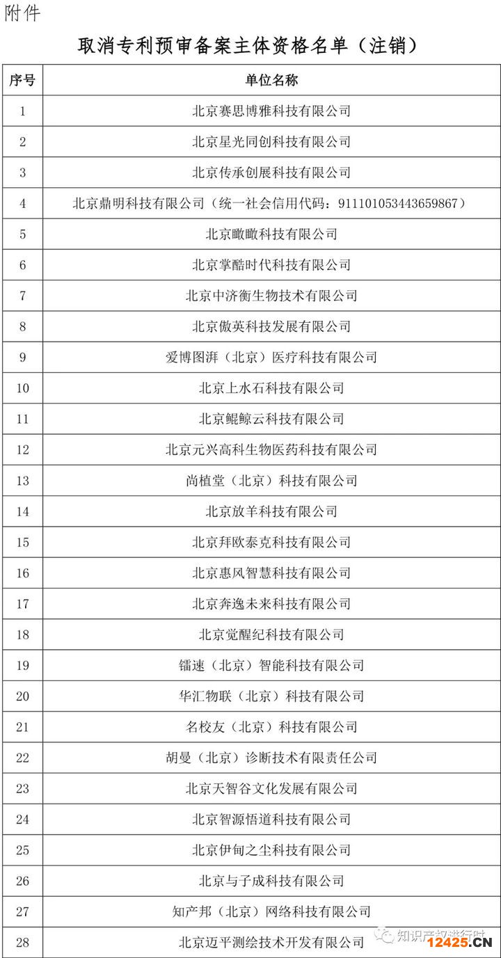根據(jù)國家知識產(chǎn)權(quán)局辦公室《專利申請預審業(yè)務管理辦法(試行)》(國知辦發(fā)辦字〔2023〕25號)的有關要求,結(jié)合《北京市知識產(chǎn)權(quán)保護中心專利申請預審服務管理辦法》相關規(guī)定,我中心對全市已通過國家知識產(chǎn)權(quán)局核準的專利預審備案單位的基本情況進行再次核查。經(jīng)核實,北京賽思博雅科技有限公司等65家單位的經(jīng)營狀態(tài)為注銷,北京有感科技有限責任公司等34家備案主體的注冊地轉(zhuǎn)移至京外,不符合國家知識產(chǎn)權(quán)局對專利預審備案主體的相關要求,即日起取消上述99家單位的專利預審備案主體資格。具體名單詳見附件。