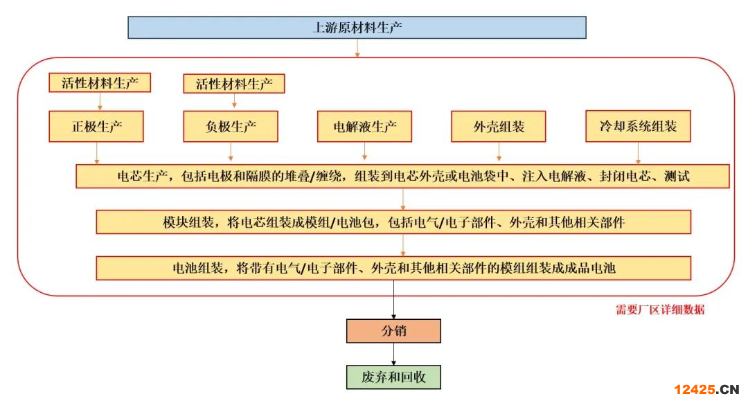 這個(gè)計(jì)算的系統(tǒng)邊界如下圖所示,涵蓋了多個(gè)環(huán)節(jié):原材料獲取和初加工、主要產(chǎn)品生產(chǎn)、分銷(xiāo)、生命周期末期處理和回收,不包括電池使用階段。其中,紅色邊框標(biāo)注的生產(chǎn)環(huán)節(jié)被強(qiáng)制要求提供廠區(qū)具體數(shù)據(jù),這代表著這些環(huán)節(jié)的生產(chǎn)商需要依據(jù)PEF標(biāo)準(zhǔn)披露準(zhǔn)確的碳足跡數(shù)據(jù)。