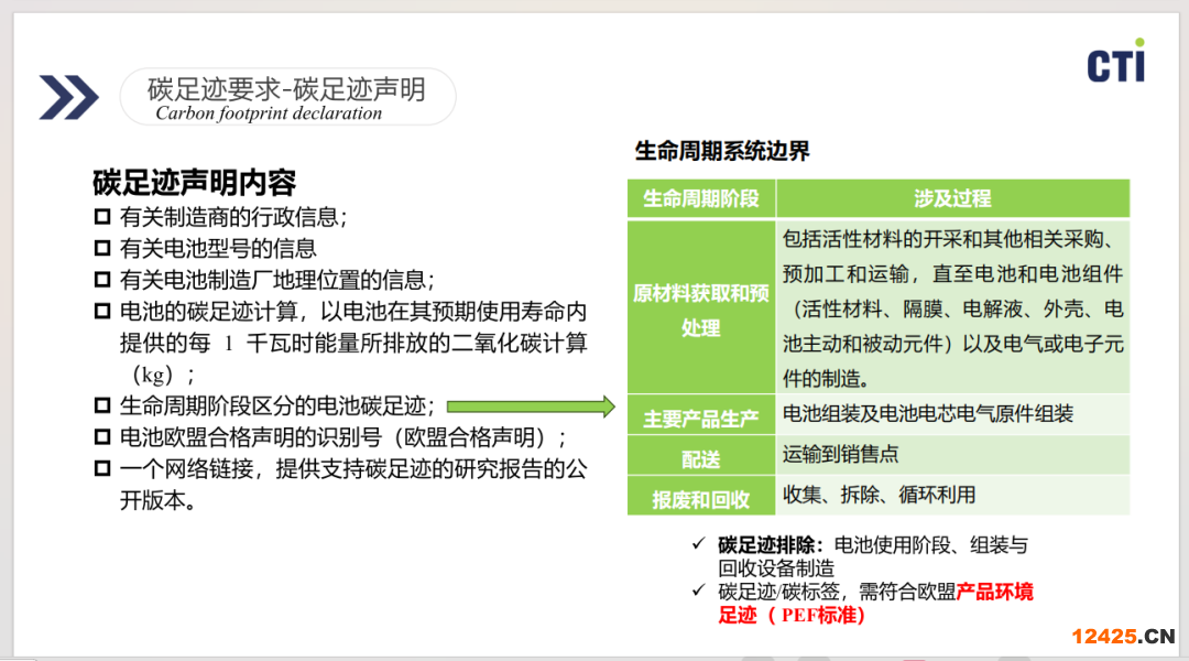 電池應(yīng)具有清晰可辨、不可擦除的碳足跡標(biāo)簽,包括電池生產(chǎn)過(guò)程中使用的可回收鈷、鉛、鋰和鎳的含量。碳足跡以電池在預(yù)期使用壽命內(nèi)提供的總能量每kWh產(chǎn)生的二氧化碳當(dāng)量(kg)計(jì)算,并需聲明每個(gè)制造廠相關(guān)電池型號(hào)對(duì)應(yīng)的碳足跡性能等級(jí)。