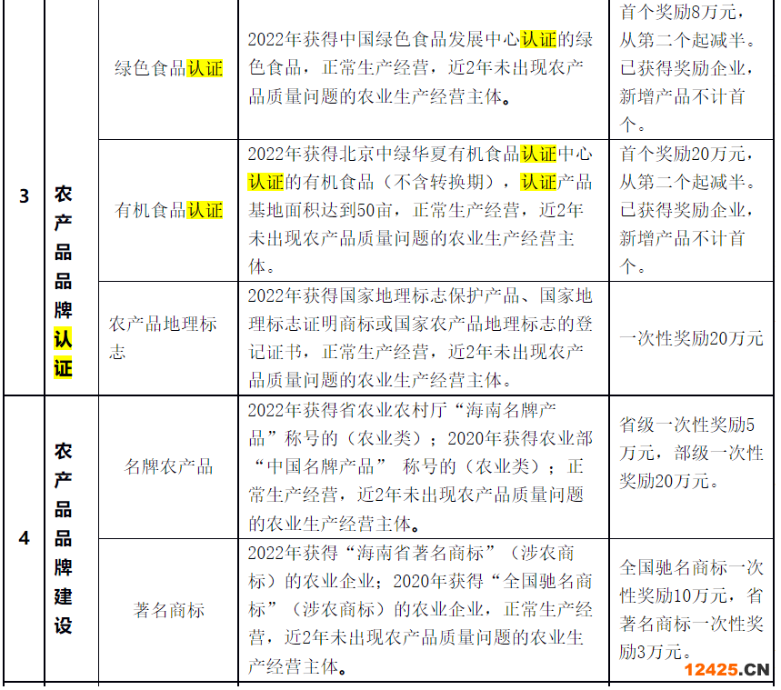 陵水縣對2022年獲得國際質(zhì)量(HACCP)、國際標(biāo)準(zhǔn)化組織(ISO9000、ISO9001、ISO9002)、良好農(nóng)業(yè)規(guī)范(GAP)認(rèn)證的種植業(yè)、畜牧業(yè)和養(yǎng)殖業(yè),正常生產(chǎn)經(jīng)營,近2年未出現(xiàn)農(nóng)產(chǎn)品質(zhì)量問題的農(nóng)業(yè)生產(chǎn)經(jīng)營主體,且產(chǎn)品獲得綠色食品、有機(jī)食品或地理標(biāo)志產(chǎn)品認(rèn)證的(有效期內(nèi)),一次性獎勵5萬元。