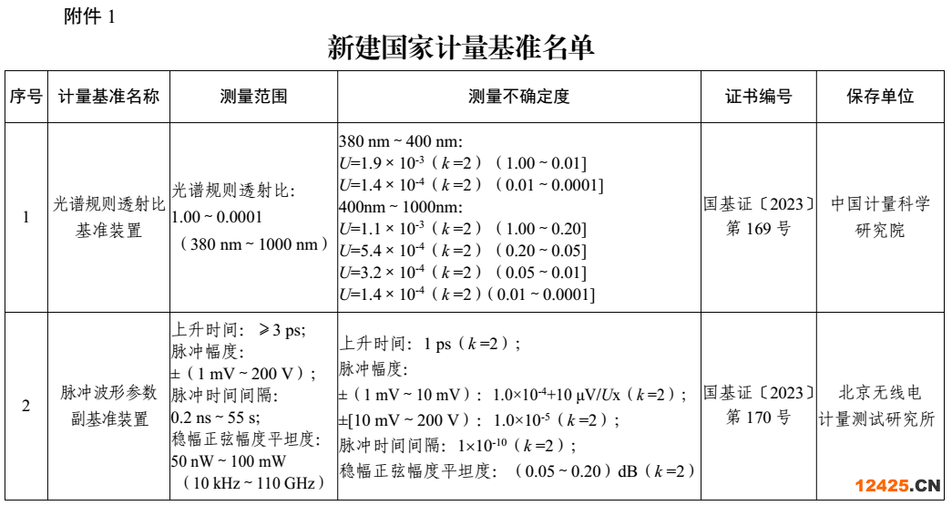 根據《中華人民共和國計量法》《中華人民共和國計量法實施細則》以及《計量基準管理辦法》相關規(guī)定,批準建立“光譜規(guī)則透射比基準裝置”“脈沖波形參數副基準裝置”,頒發(fā)國家計量基準證書;提升“直流電壓副基準裝置”技術能力,頒發(fā)新的國家計量基準證書,撤銷相應的原國家計量基準證書。