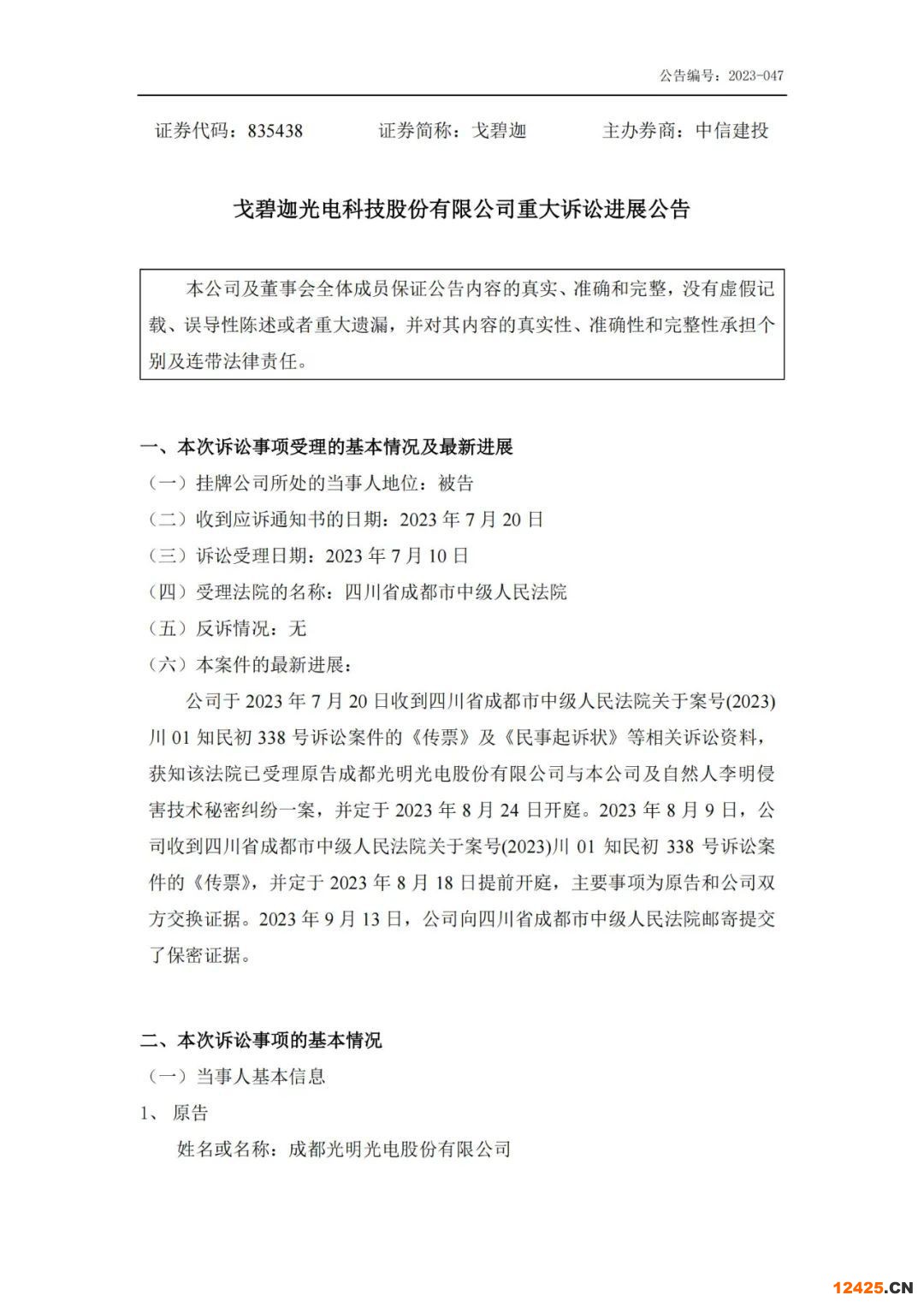9月26日,湖北戈碧迦光電科技股份有限公司(下稱戈碧迦光電)發(fā)布了關(guān)于重大訴訟進展的公告。公告顯示,成都光明光電股份有限公司(下稱光明光電)以侵害技術(shù)秘密為由,在四川省成都市中級人民法院對戈碧迦光電提起訴訟。