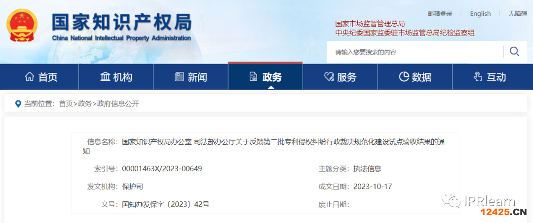 關于反饋第二批專利侵權糾紛行政裁決規(guī)范化建設試點驗收結果的通知