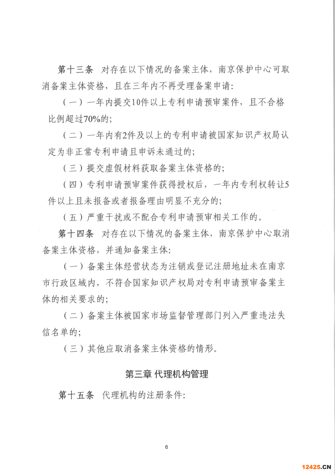第十三條對(duì)存在以下情況的備案主體,南京保護(hù)中心可取消備案主體資格,且在三年內(nèi)不再受理備案申請(qǐng):(一)一年內(nèi)提交10件以上專利申請(qǐng)預(yù)審案件,且不合格比例超過70%的;(二)一年內(nèi)有2件及以上的專利申請(qǐng)被國家知識(shí)產(chǎn)權(quán)局認(rèn)定為非正常專利申請(qǐng)且申訴未通過的;(三)提交虛假材料獲取備案主體資格的;(四)專利申請(qǐng)預(yù)審案件獲得授權(quán)后,一年內(nèi)專利權(quán)轉(zhuǎn)讓5件以上且未報(bào)備或者報(bào)備理由明顯不充分的;(五)嚴(yán)重干擾或不配合專利申請(qǐng)預(yù)審相關(guān)工作的。