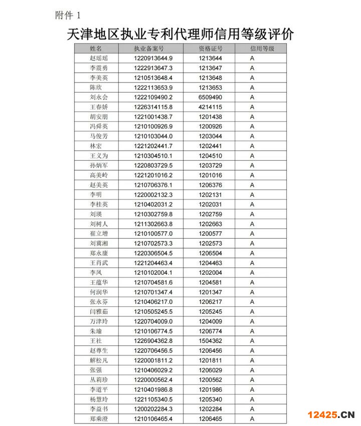 附件1.天津地區(qū)執(zhí)業(yè)專利代理師信用等級(jí)評(píng)價(jià)