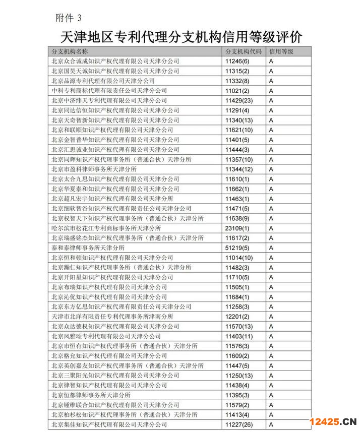附件3.天津地區(qū)專利代理分支機(jī)構(gòu)信用等級(jí)評(píng)價(jià)