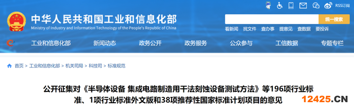 根據(jù)標(biāo)準(zhǔn)化工作的總體安排,現(xiàn)將申請立項的《半導(dǎo)體設(shè)備 集成電路制造用干法刻蝕設(shè)備測試方法》等196項行業(yè)標(biāo)準(zhǔn)、《雪蓮養(yǎng)護(hù)貼》等1項行業(yè)標(biāo)準(zhǔn)外文版項目和《環(huán)境污染防治設(shè)備 術(shù)語》等38項推薦性國家標(biāo)準(zhǔn)計劃項目予以公示(見附件1、2、3),截止日期為2023年12月16日。如對擬立項標(biāo)準(zhǔn)項目有不同意見,請在公示期間填寫《標(biāo)準(zhǔn)立項反饋意見表》(見附件4)并反饋至我司,電子郵件發(fā)送至KJBZ@miit.gov.cn(郵件主題注明:標(biāo)準(zhǔn)立項公示反饋)。
