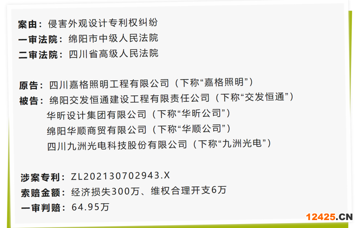 2023年3月13日,四川綿陽市中級人民法院受理了嘉格照明起訴交發(fā)恒通、華昕公司、華順公司、九洲光電專利侵權(quán)一案。