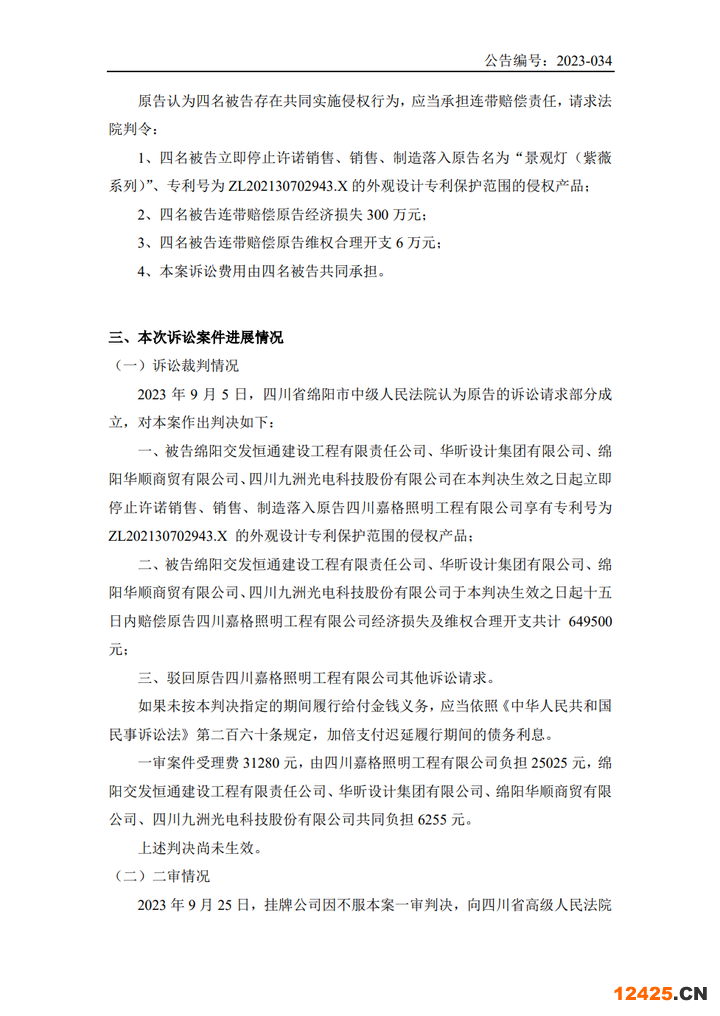 11月17日,九洲光電收到四川高院關(guān)于本案二審的《受理通知書》((2023)川知民終 560 號)。