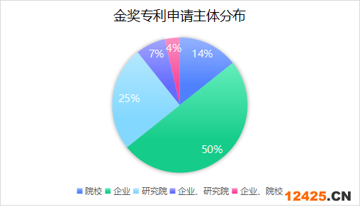 金獎專利的專利權(quán)人類型分布情況如下圖所示,以企業(yè)為申請主體獲得專利金獎的權(quán)利人占比達50%,研究院占比為25%,其他為院校、企業(yè)和研究院、企業(yè)和院校。值得一提的是,西安交通大學(xué)有兩項專利獲得金獎。