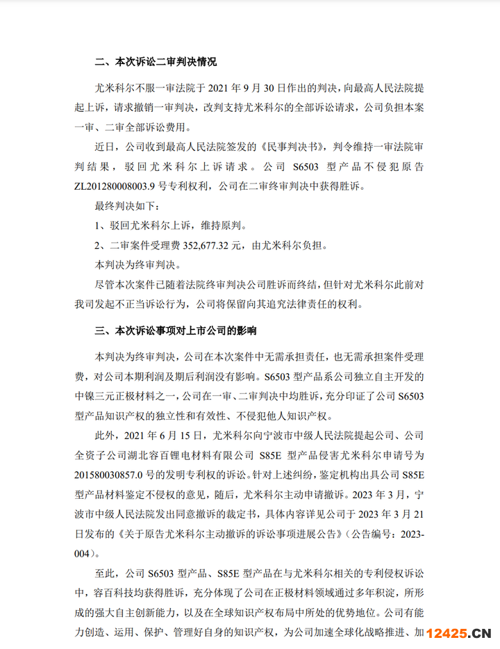 2023年12月7日,寧波容百新能源科技股份有限公司(下稱容百科技)發(fā)布專利侵權(quán)訴訟二審終審判決勝訴的公告,宣布與尤米科爾公司(UMICORE)持續(xù)三年多、涉案6000余萬(wàn)的專利糾紛正式落幕。