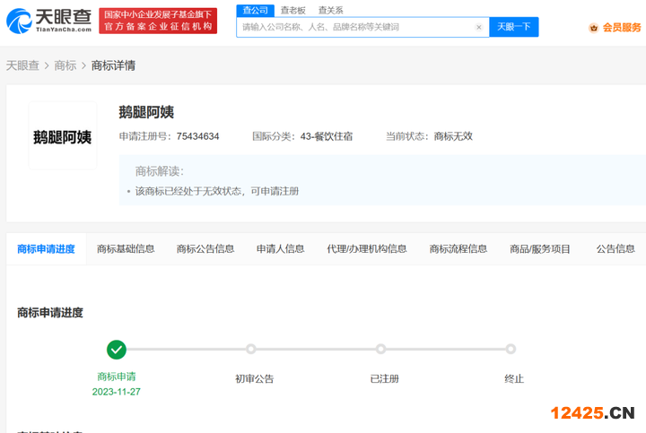 天眼查App顯示,今年11月,“鵝腿阿姨”商標(biāo)被自然人程某申請(qǐng)注冊(cè),國(guó)際分類(lèi)為餐飲住宿。不過(guò),12月初,程某撤回商標(biāo)注冊(cè)申請(qǐng),目前該商標(biāo)狀態(tài)為無(wú)效。