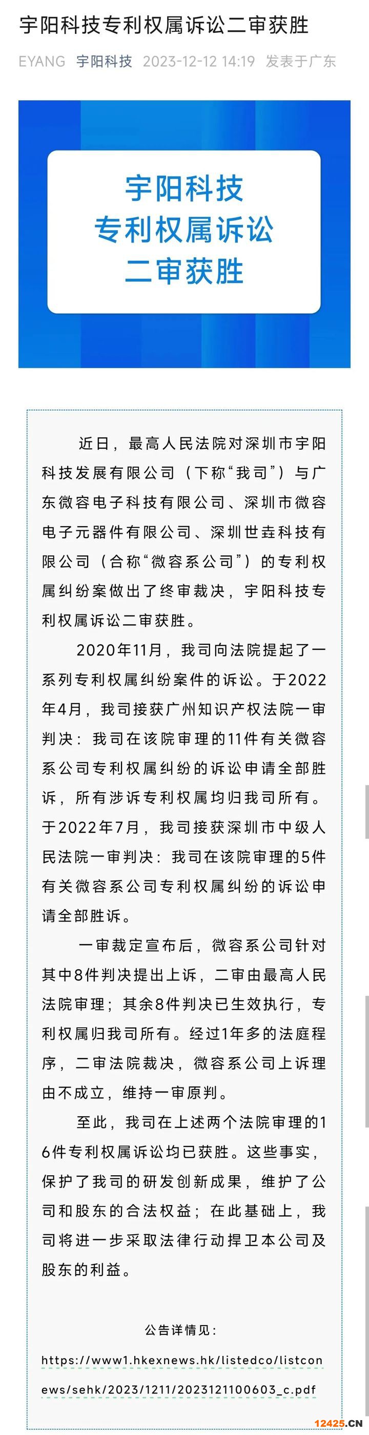 2023年12月12日,深圳市宇陽科技發(fā)展有限公司(下稱宇陽科技)在官方微信發(fā)布了一則標(biāo)題為“宇陽科技專利權(quán)屬訴訟二審獲勝”的信息。宇陽科技表示,其在與廣東微容電子科技有限公司(下稱廣東微容)、深圳市微容電子元器件有限公司(下稱深圳微容)、深圳世垚科技有限公司(下稱世垚科技)(三被告合稱微容系公司)的16項(xiàng)權(quán)屬糾紛訴訟中獲勝。