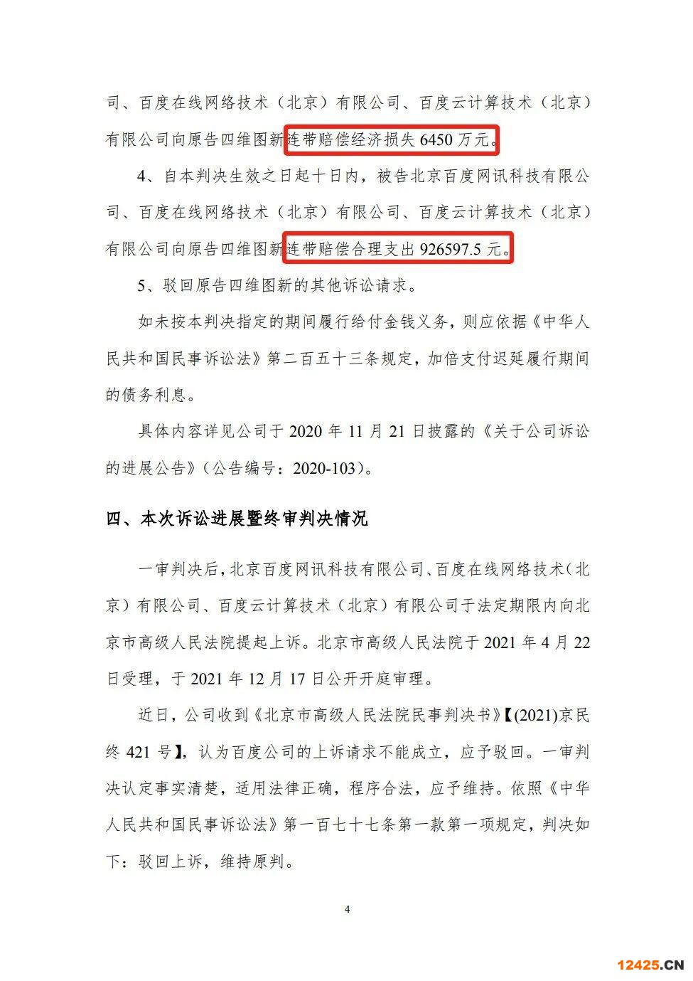 近日,四維圖新收到《北京市高級人民法院民事判決書》【(2021)京民終421號】作出的終審判決:駁回上訴,維持原判。