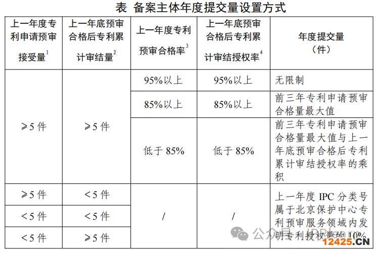 北京保護(hù)中心建立備案主體專利申請(qǐng)預(yù)審質(zhì)量監(jiān)測(cè)機(jī)制,根據(jù)專利申請(qǐng)預(yù)審合格及預(yù)審合格后審結(jié)授權(quán)情況,分級(jí)設(shè)置備案主體年度提交量,具體設(shè)置如下: