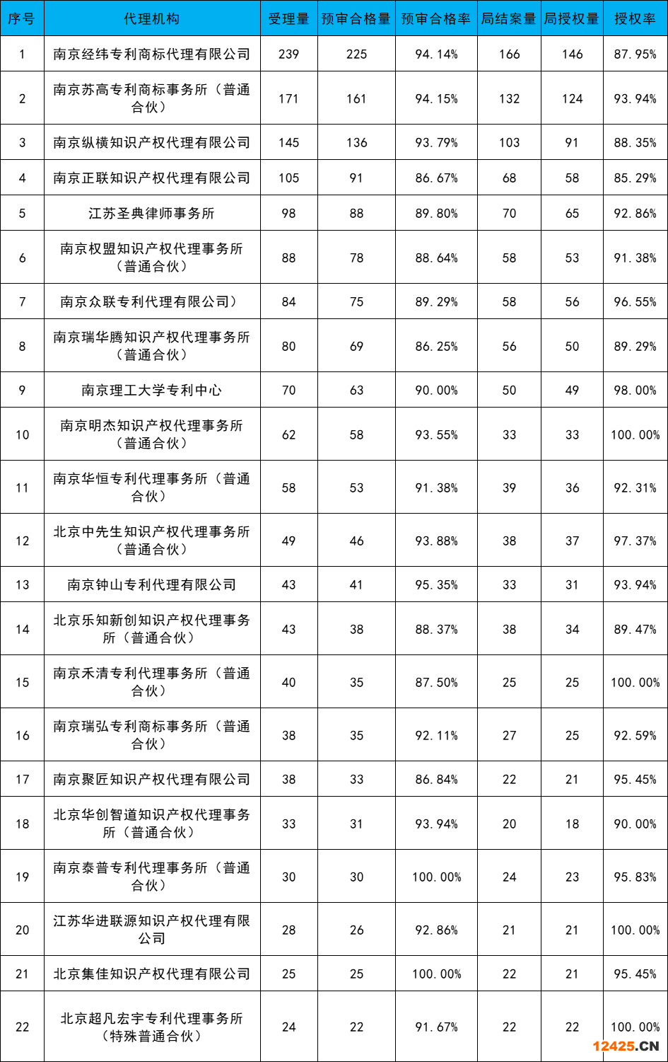 局結(jié)案量大于20件且預審合格率和授權(quán)率均大于85%的代理機構(gòu)有22家。