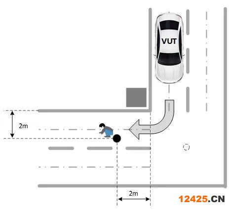 在IVISTA 2023版智能泊車分指數(shù)-記憶泊車規(guī)程中,針對(duì)消費(fèi)者在日常停車場(chǎng)泊車場(chǎng)景下極易遇到的兒童盲區(qū)干擾危險(xiǎn)場(chǎng)景,引入了車輛“右轉(zhuǎn)彎遇下蹲兒童測(cè)評(píng)場(chǎng)景”。本測(cè)試場(chǎng)景模擬車輛在車庫(kù)路口右轉(zhuǎn)彎時(shí),在其盲區(qū)遇到車庫(kù)立柱遮擋的下蹲兒童(3-6歲)的情況,試驗(yàn)時(shí)下蹲靜止兒童背對(duì)來(lái)車方向,兒童所處位置與路口距離為2m,與其右側(cè)道路邊緣線距離為2m。試驗(yàn)車輛由記憶泊車系統(tǒng)控制方向和速度經(jīng)過(guò)該場(chǎng)景,考察車輛對(duì)其行駛環(huán)境周圍出現(xiàn)的下蹲兒童的安全應(yīng)對(duì)能力。
