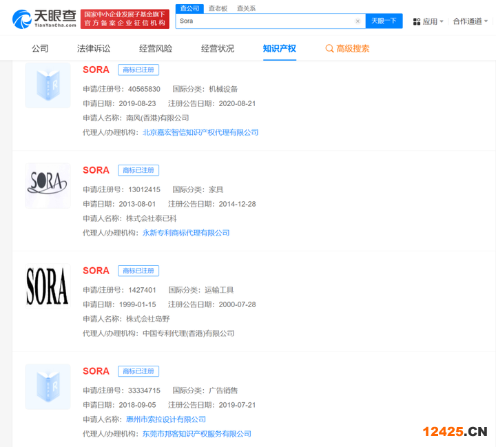 SORA已被多方注冊商標(biāo),最早申請于1999年