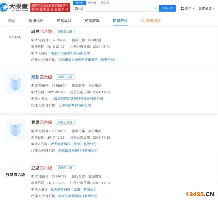 天眼查知識產(chǎn)權(quán)信息顯示,“四六級”曾被多方申請注冊為商標(biāo),申請人包括餐飲公司、科技公司,國際分類包括餐飲住宿、廣告銷售、食品,不過,上述商標(biāo)均已被駁回處于無效狀態(tài)。此外,“豆腐四六級”“扇貝四六級”“四六級鍋巴”等也被申請注冊商標(biāo),申請人包括教育科技公司、投資公司等,國際分類包括方便食品、通訊服務(wù)、金融物管等,其中部分商標(biāo)狀態(tài)為已注冊。