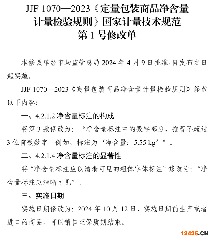 近日,市場監(jiān)管總局批準(zhǔn)發(fā)布JJF 1070—2023《定量包裝商品凈含量計(jì)量檢驗(yàn)規(guī)則》國家計(jì)量技術(shù)規(guī)范第1號修改單,JJF 1070-2023《定量包裝商品凈含量計(jì)量檢驗(yàn)規(guī)則》將于2024年10月12日正式實(shí)施。