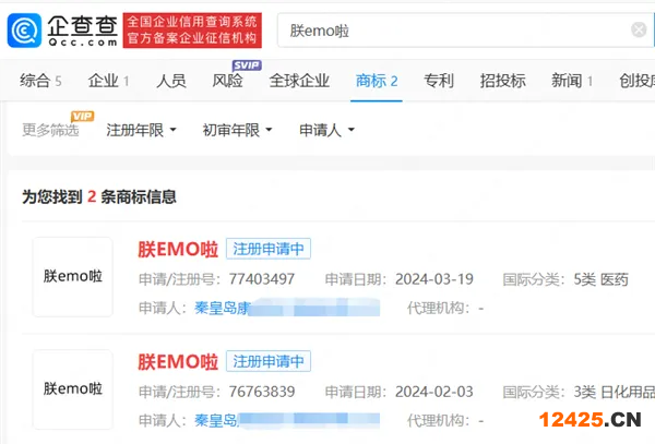 企查查APP顯示,“朕EMO啦”近日被某醫(yī)療器械公司申請(qǐng)注冊(cè)商標(biāo),國(guó)際分類(lèi)涉及醫(yī)藥等,當(dāng)前狀態(tài)均為注冊(cè)申請(qǐng)中。
